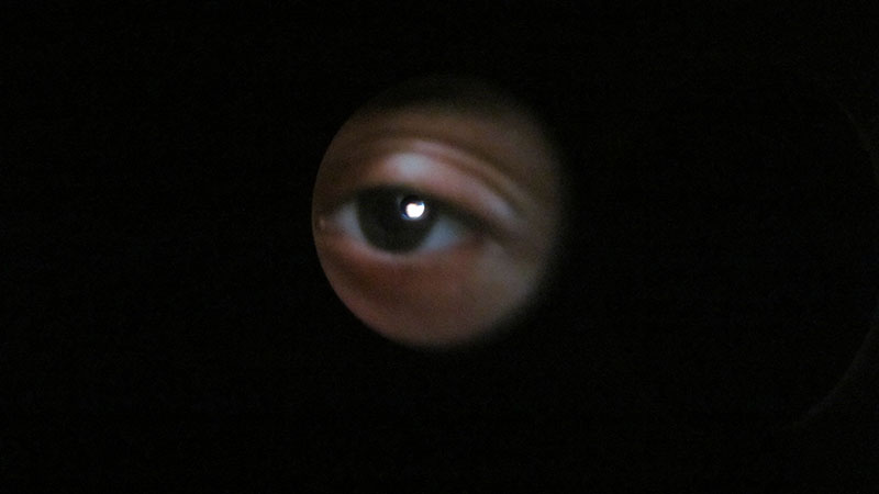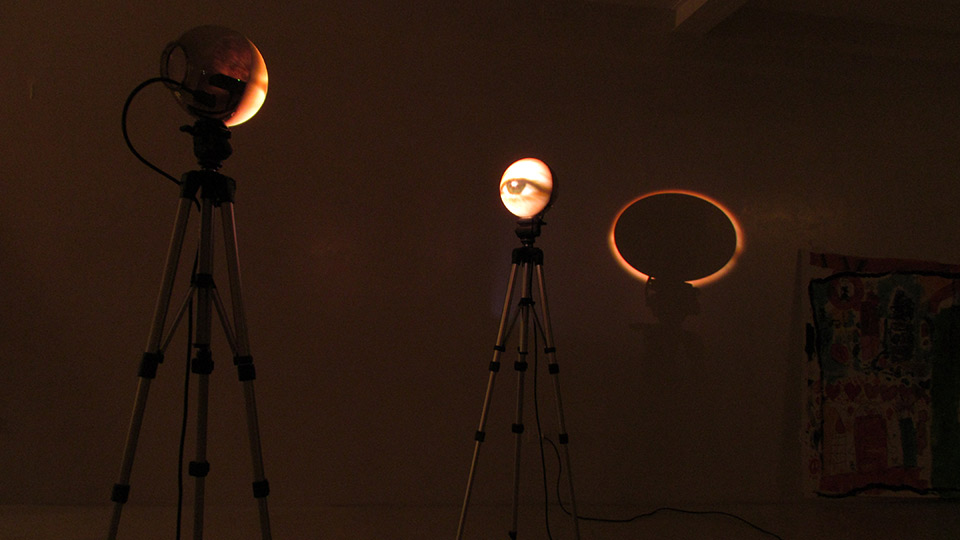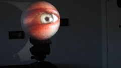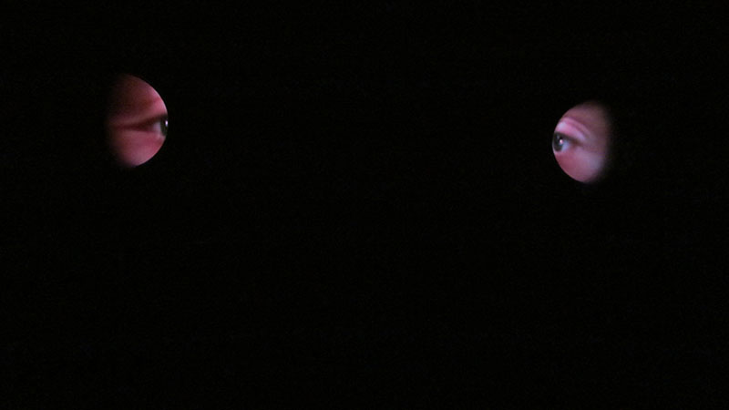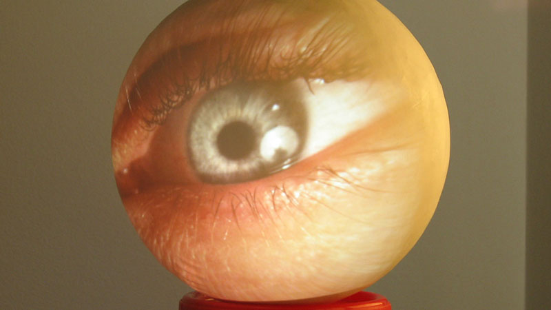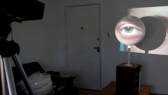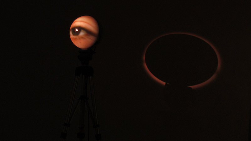 La imagen de video proyectada consiste en un plano detalle de un ojo humano, que eventualmente parpadea.