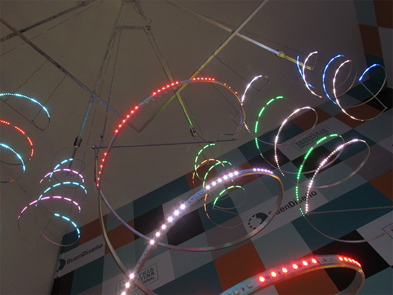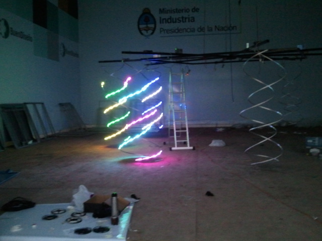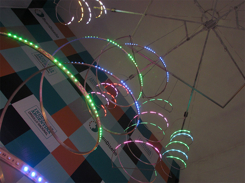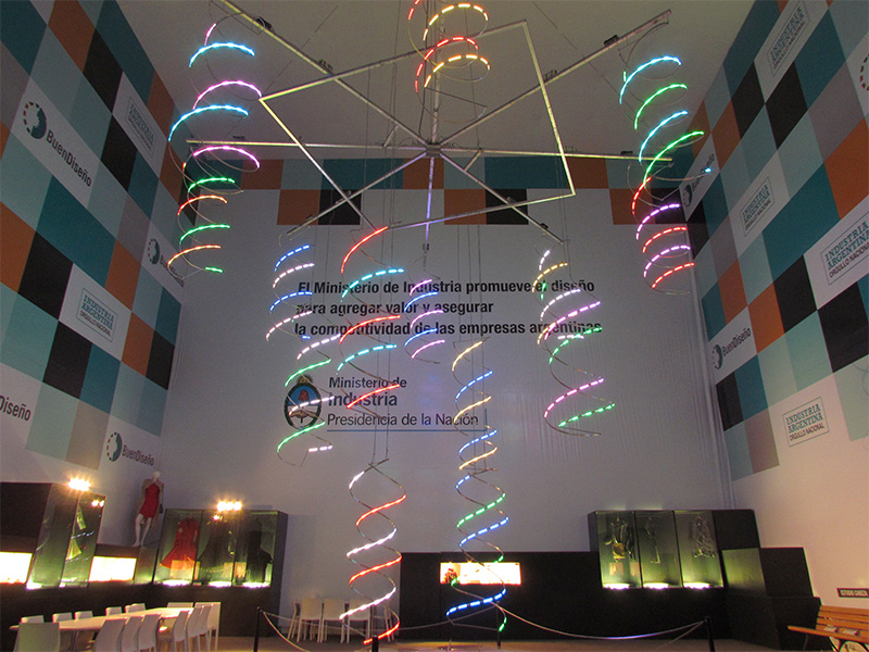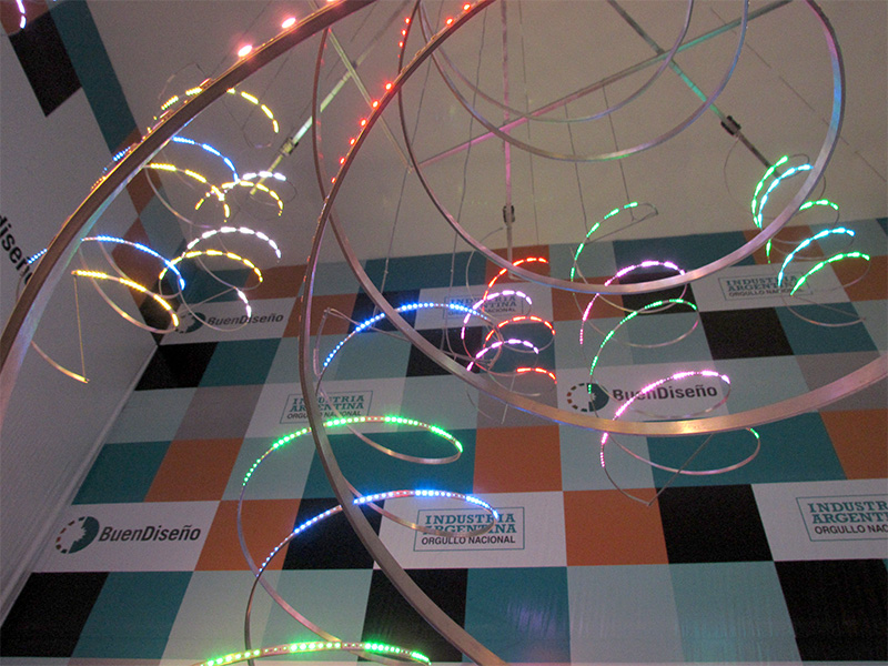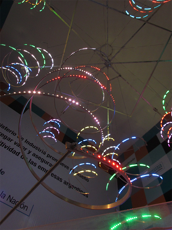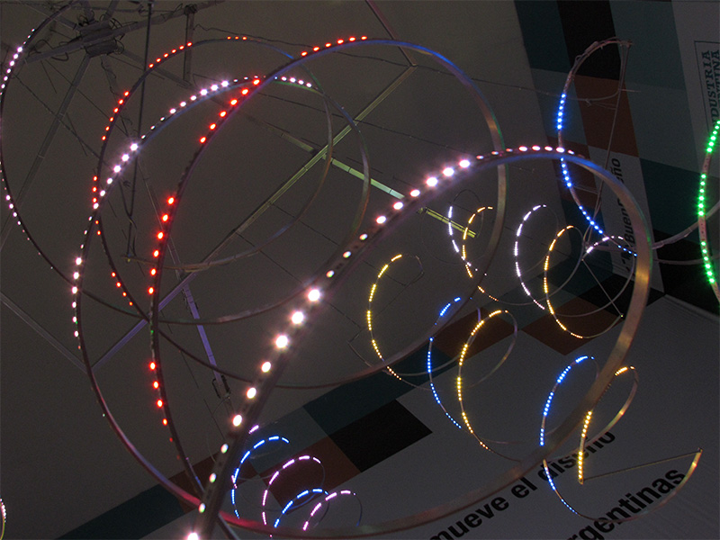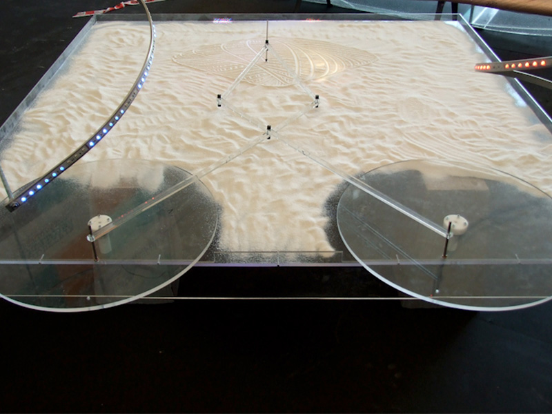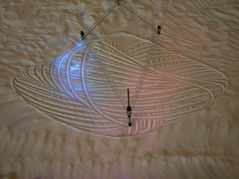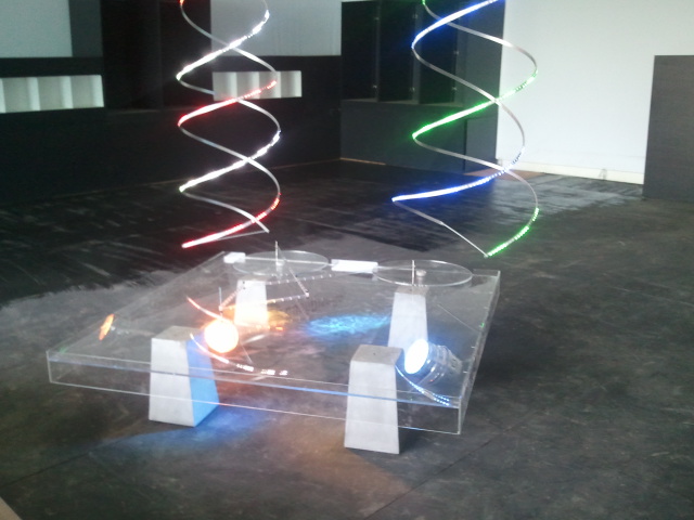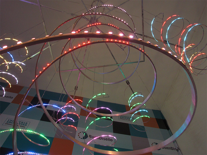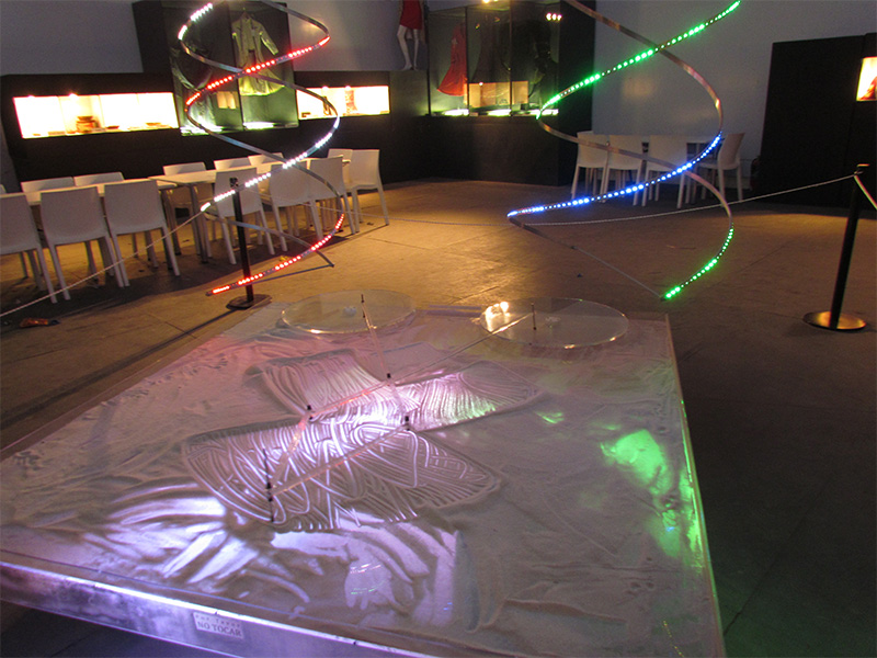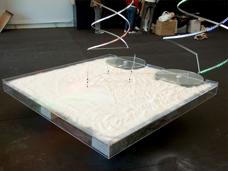 Instalación lumínico-cinética que estubo ubicada en el Cubo del Parque Industria Argentina, de Tecnópolis. La parte superior de la instalación consta de 14 pares de hélices de 2,30 mts. de altura cada una, compuestas por flejes de aluminio y LEDs RGB que secuencian en distintos colores. Los 8 pares de hélices del nivel más alto (a 8 metros de altura) se combinan, dando una segunda generación de 4 pares de hélices en el nivel del medio, que heredaron la mitad de los colores del nivel superior. Esta operación se repite con los 4 pares de hélices del nivel del medio, que se combinan formando otros 2 pares de hélices finales. Estos últimos a su vez, entregan su información a los discos de acrílico giratorios de la máquina que dibuja, ubicada en la parte inferior de la instalación. La suma de los movimientos oscilatorios de ambos discos, se traduce en el dibujo de diferentes patrones sobre la arena.