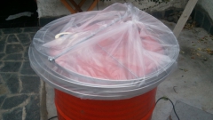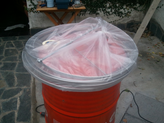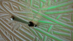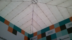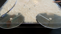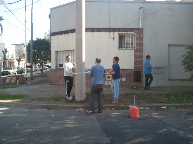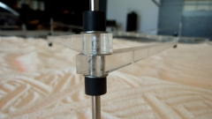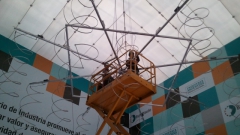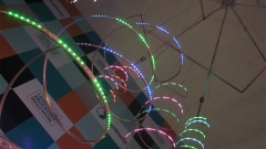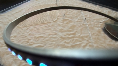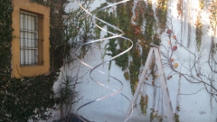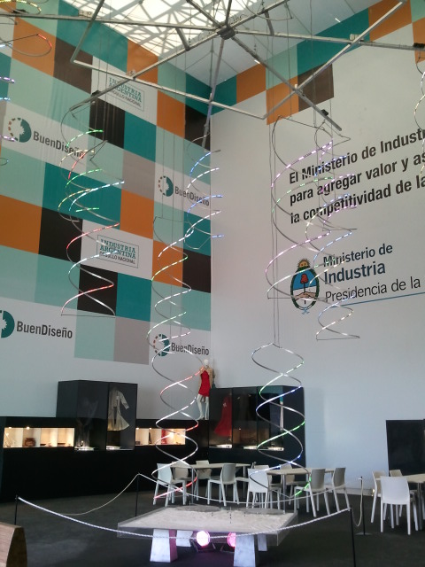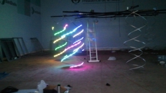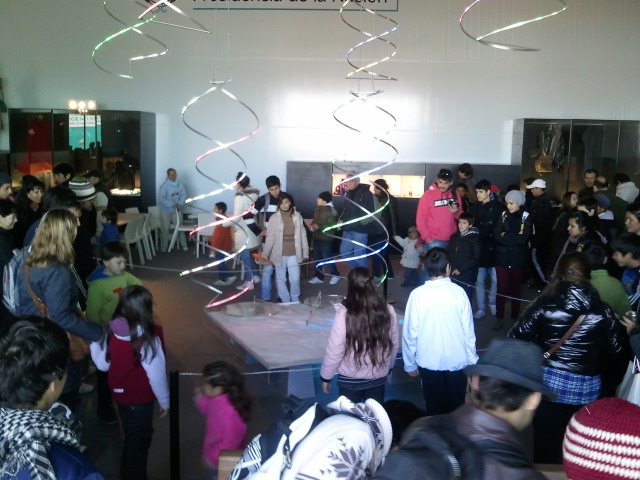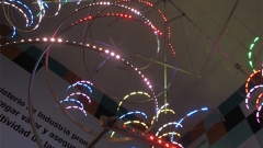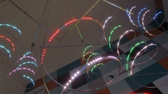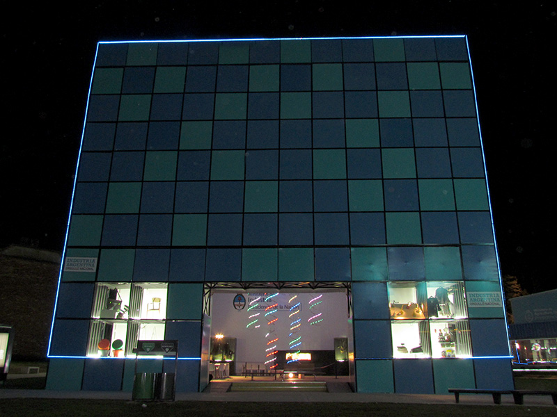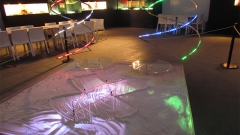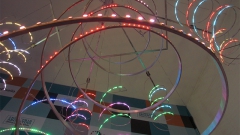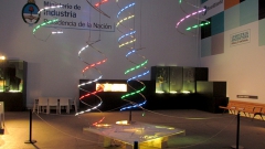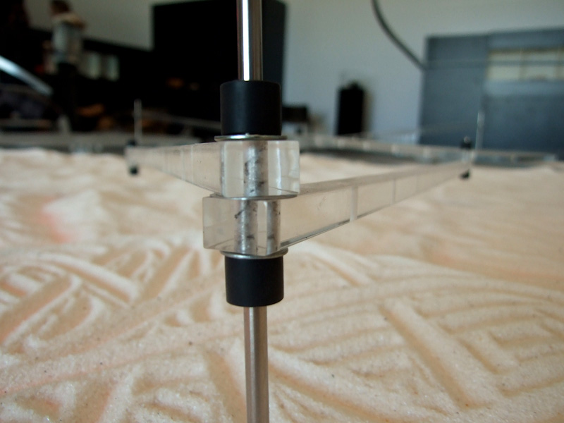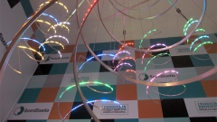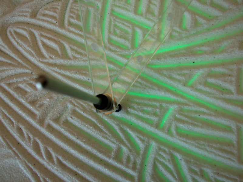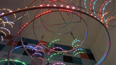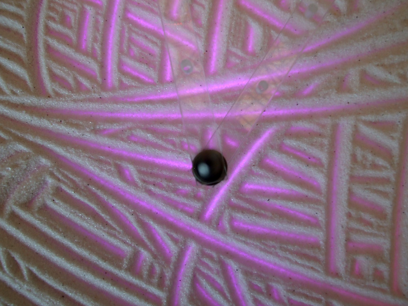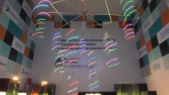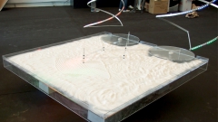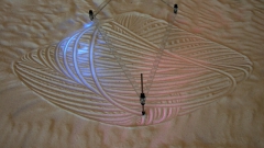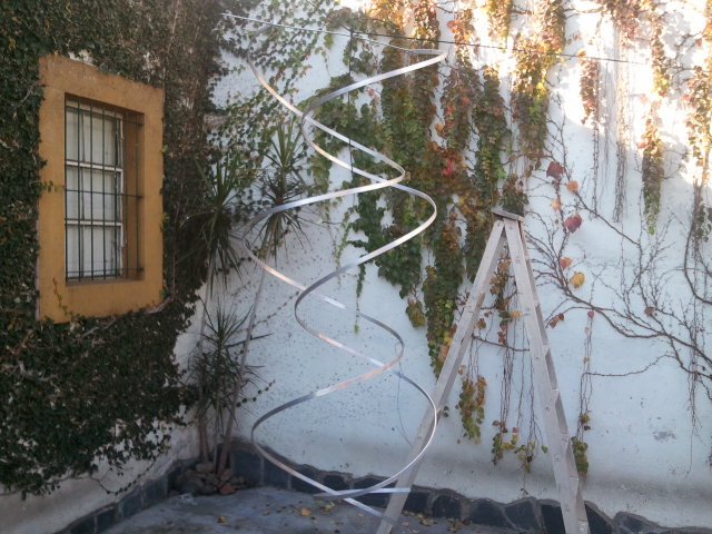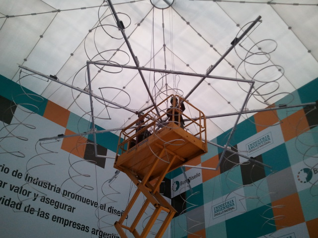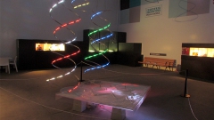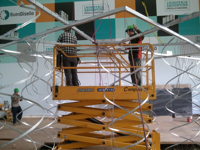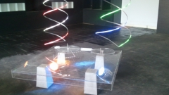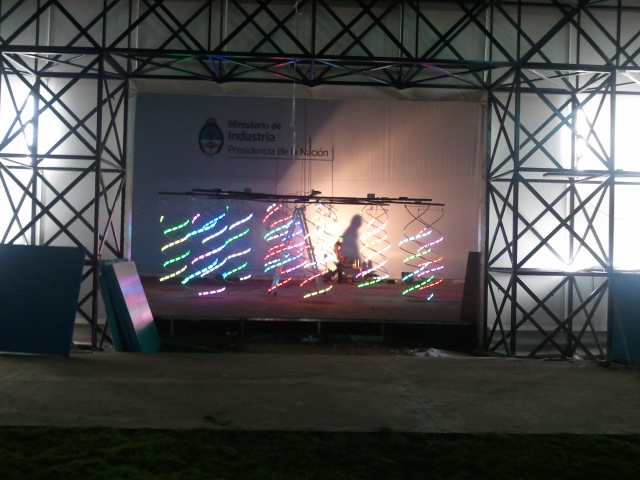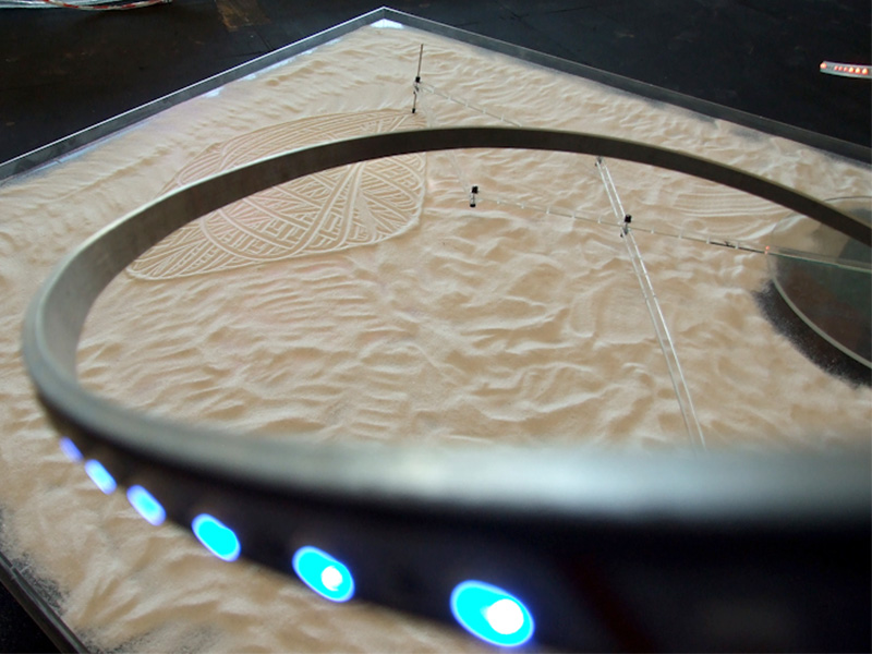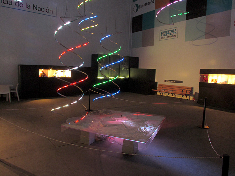 Instalación lumínico-cinética que estubo ubicada en el Cubo del Parque Industria Argentina, de Tecnópolis. La parte superior de la instalación consta de 14 pares de hélices de 2,30 mts. de altura cada una, compuestas por flejes de aluminio y LEDs RGB que secuencian en distintos colores. Los 8 pares de hélices del nivel más alto (a 8 metros de altura) se combinan, dando una segunda generación de 4 pares de hélices en el nivel del medio, que heredaron la mitad de los colores del nivel superior. Esta operación se repite con los 4 pares de hélices del nivel del medio, que se combinan formando otros 2 pares de hélices finales. Estos últimos a su vez, entregan su información a los discos de acrílico giratorios de la máquina que dibuja, ubicada en la parte inferior de la instalación. La suma de los movimientos oscilatorios de ambos discos, se traduce en el dibujo de diferentes patrones sobre la arena.