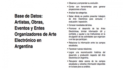 La investigación tiene como objetivo principal generar una herramienta útil para la observación de las artes electrónicas en la Argentina. Busca ofrecer bases sólidas de conocimiento que favorezcan el análisis histórico y situacional las artes electrónicas, y el diseño de futuros proyectos de investigación y producción. El próximo paso para el proyecto es, además de continuar el desarrollo de la base de datos, publicarla en Internet para dar acceso a la misma a toda la comunidad.