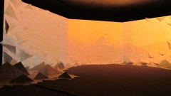 Instalación. En una habitación vacía y oscura, el usuario explora el espacio a través de la interacción, intentando establecer correspondencias entre acciones y reacciones a partir del uso de la razón. Haces de luz láser y programación.