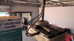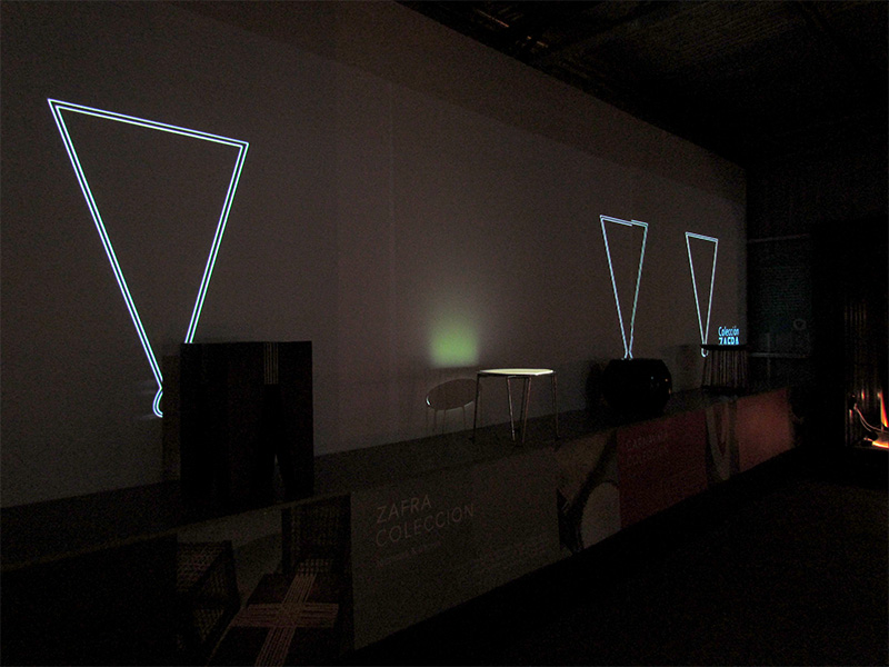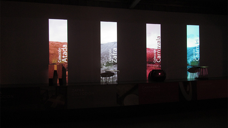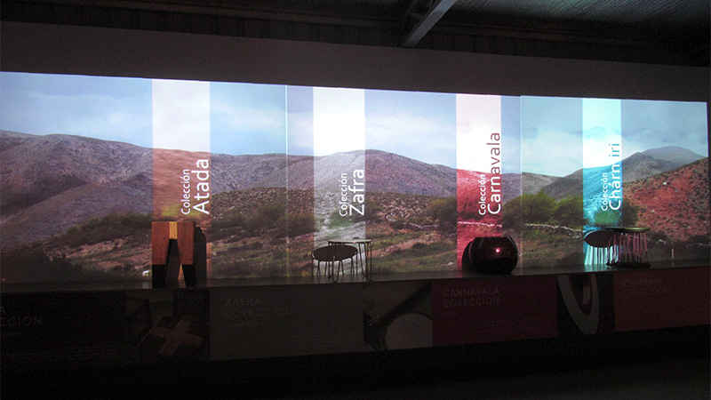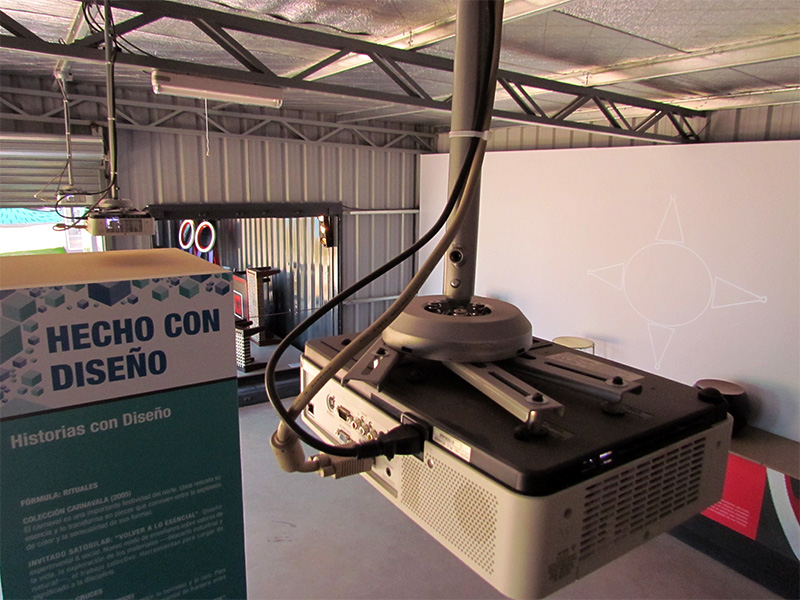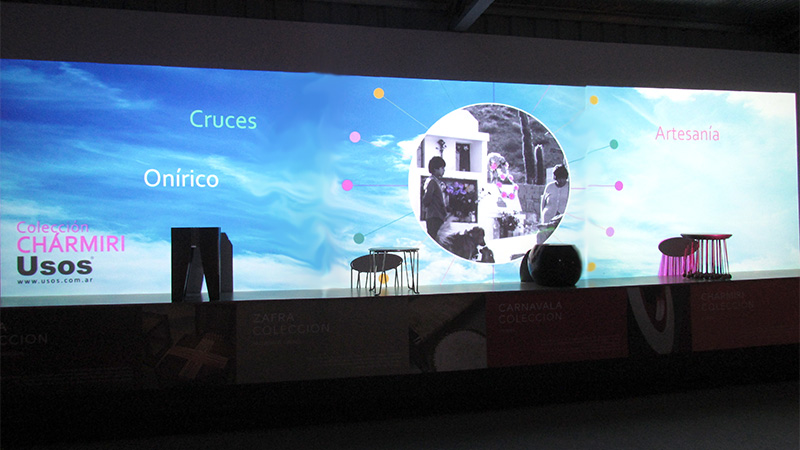 Para cumplir exitosamente con este interesante desafío, nos interiorizamos acerca de la historia, y el contexto social y cultural del estudio, llevando a cabo un comprometido trabajo de investigación, y estableciendo un estrecho vínculo con sus creadores y diseñadores. Como resultado diseñamos una experiencia visual que consiste en una proyección panorámica sobre 4 objetos de diseño, ubicados y mapeados estratégicamente sobre una tarima. Esta proyección dialoga constantemente con los objetos reales, abordando sus diferentes etapas de producción, y los conceptos y emociones relacionados con cada uno de ellos.